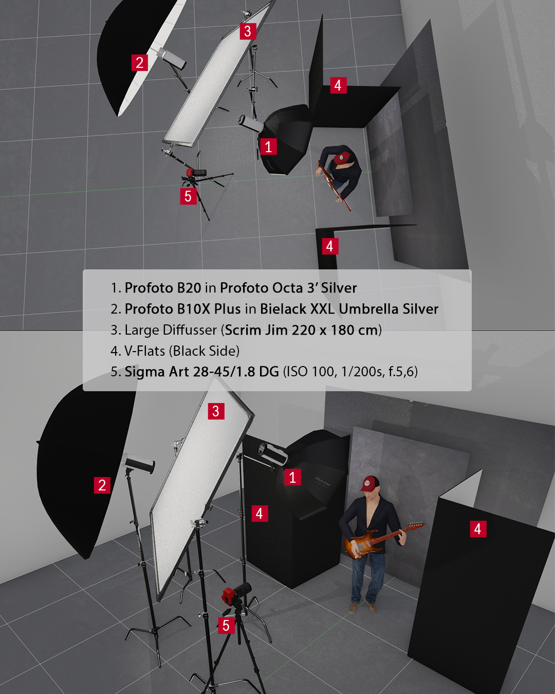 Przygotowałem setup oświetleniowy dokładnie wg recepty Annie Leibovitz. Można powiedzieć, że odtworzyłem setup, którego Annnie użyła fotografując byłą Pierwszą Damę USA, Michelle Obama. Wyglądał on następująco: