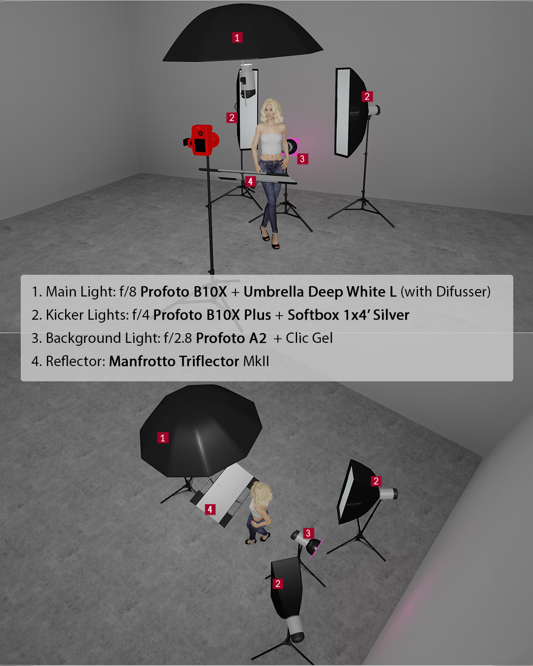 Pod nim ustawiłem Manfrotto Triflector, czyli lekką aluminiową konstrukcję z trzema niezależnie regulowanymi płaszczyznami odbijającymi. Idealnie rozbija cienie pod brodą i tworzy bardzo charakterystyczne odbicie w oku.