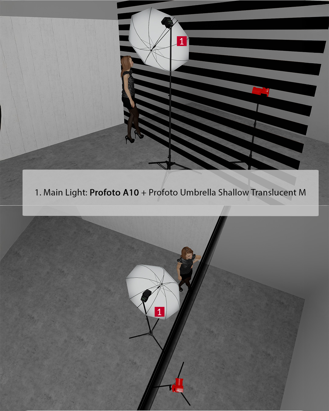 Za modelką stanęły dwa stripboksy 120×30 cm jako światła typu „kicker”.
