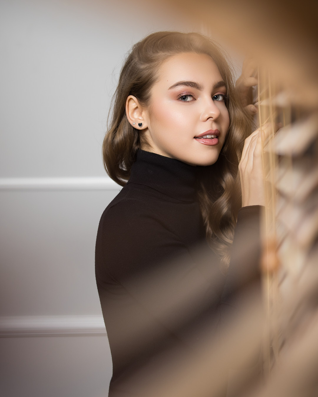 Taki setup daje miękki, naturalny portret i pięknie modeluje rysy — szczególnie w połączeniu z minimalistycznym tłem.