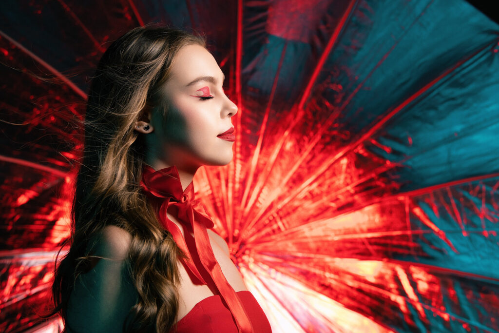 Czerwona sukienka, czerwony makijaż, czerwone tło — i kontrujące zimne wypełnienie.